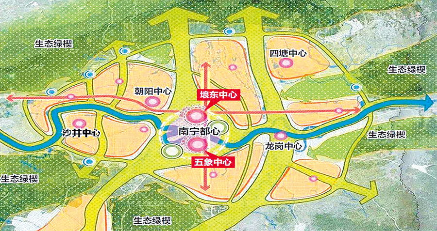 理水,重在聯江通湖,即全面提升邕江及內河水系景觀品質及格局,形成水脈擁江。