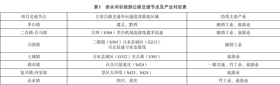 赤水河谷旅游公路起于仁懷市茅臺鎮,途經習水縣土城鎮,止于赤水市區,沿線主要以釀酒業、旅游業等第三產業為主,見表1。