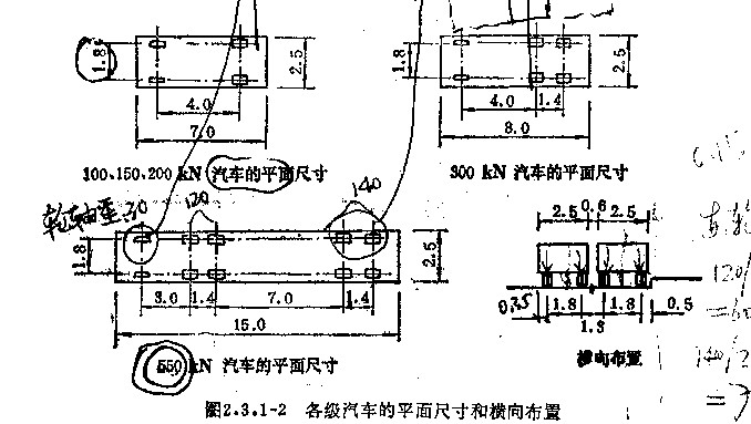 下圖是汽車車隊的縱向布置,單位是(kN),圖中可以看出汽20對應的最重車為30噸,汽超20的最重車為55噸,新聞報道中好像搞混淆了這兩個。